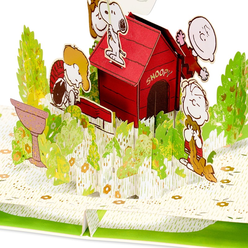 - This thinking of you card unfolds to a delightful 3D pop-up of the Peanuts gang, complete with Snoopy's doghouse and playful details