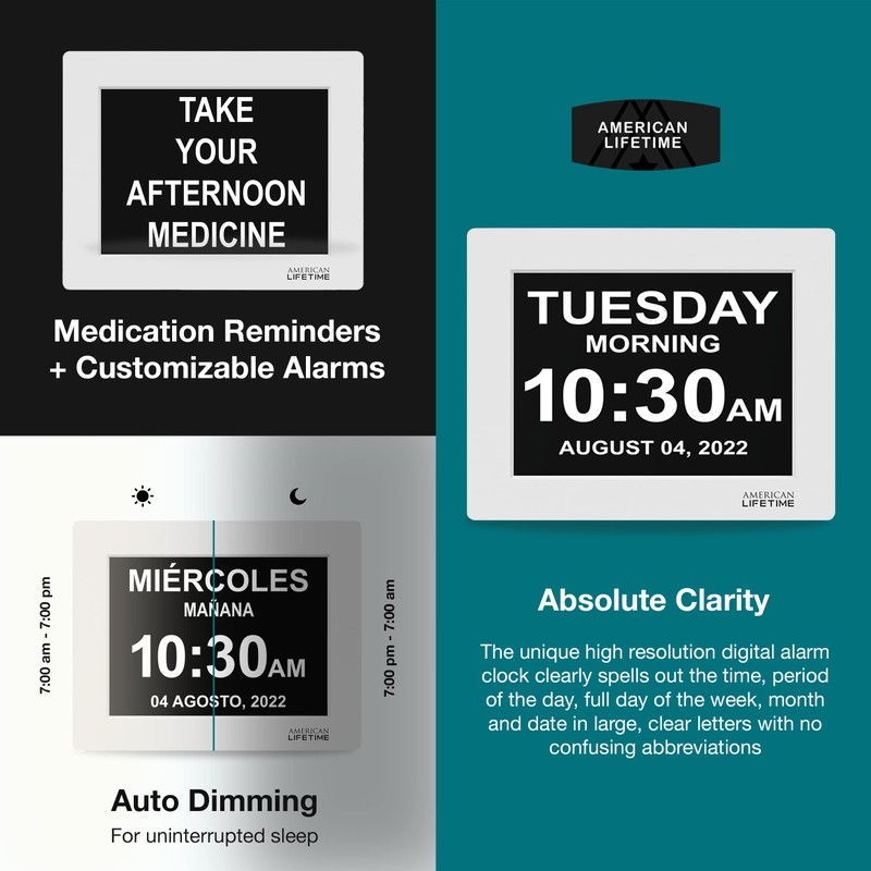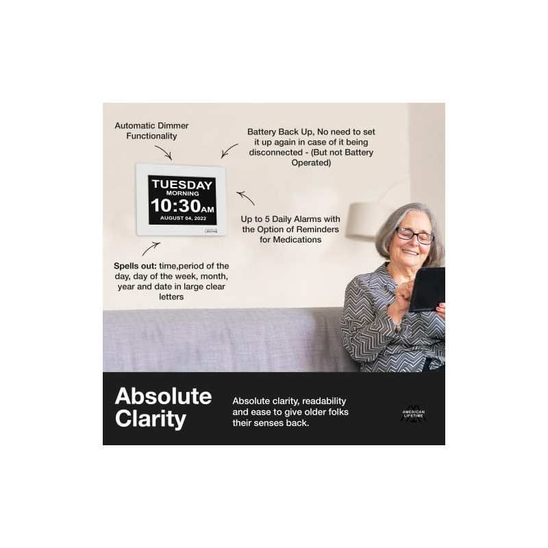 • Customizable alarms: The American Lifetime dementia clock for seniors extra large offers multiple alarm options, allowing individuals to set reminders and up to 5 daily alarms for important events, such as taking medication or appointments.