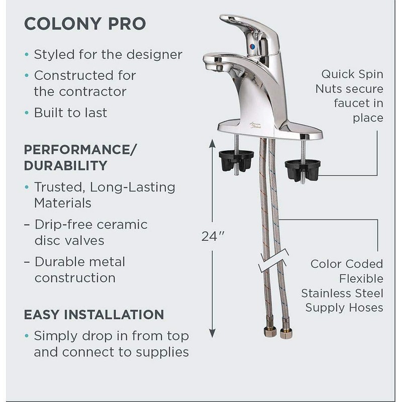 - Easy installation system: pre-assembled color coded stainless steel supply lines with pre-attached hose connections