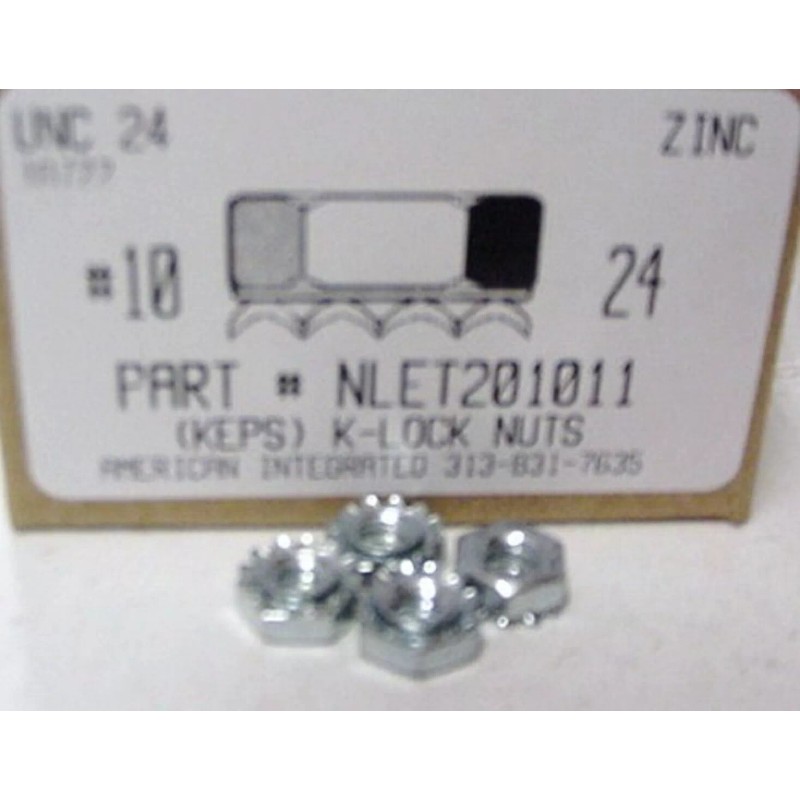 #10-24 HEX K-LOCK NUTS WITH EXTERNAL TOOTH WASHER ATTACHED STEEL ZINC PLATED. These are also available by the piece at our web site. Larger quantities are available, Please inquire. All items are packaged in heavy duty ziptop bags and well labeled, perfect size for bin restocking! We carry 1000's of other fasteners in stock for immediate shipment. We have over 50 years of experience serving Metro Detroit. Send us your requirements. For prompt Quotations, E-mail; sales at americanintegratedsupply dot com or visit us at; www dot americanintegratedsupply dot com |