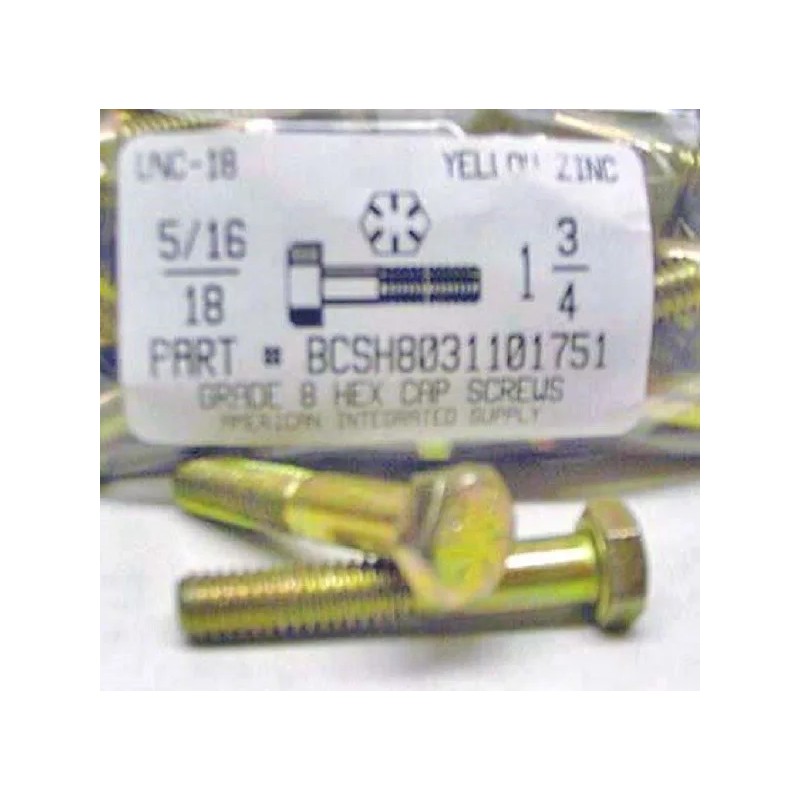 5/16-18x1-3/4 Hex Head Cap Screws Grade 8 Steel Yellow Zinc Plated. These are also available by the piece at our web site. We also carry nuts and washers to match. All items are packaged in heavy duty ziptop bags and well labeled, perfect size for bin restocking! We carry 1000's of other fasteners in stock for immediate shipment. We have over 50 years of experience serving Metro Detroit. Send us your requirements. For prompt Quotations, E-mail; sales at americanintegratedsupply dot com or visit us at; www dot americanintegratedsupply dot com