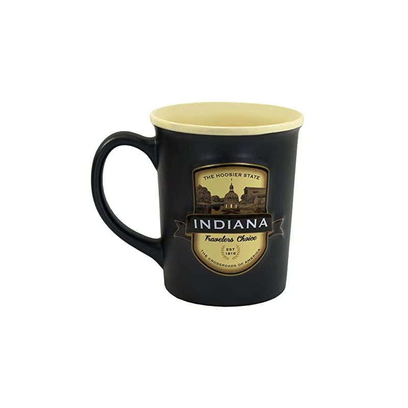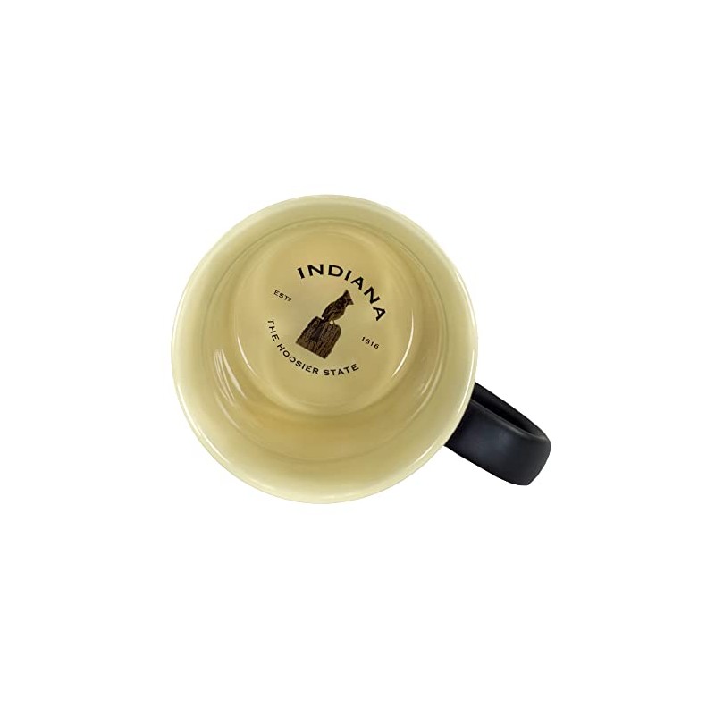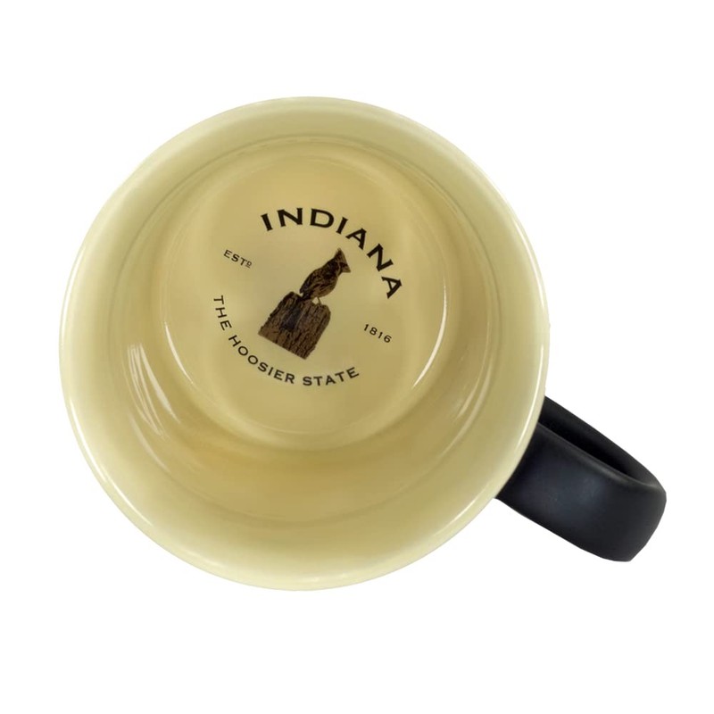 This generously sized two tone ceramic stein style mug, features a beautiful black matte exterior and contrasting tan interior inspired by the Black and Tans served in old time Irish pubs. The raised emblem features popular iconic Indiana graphics.