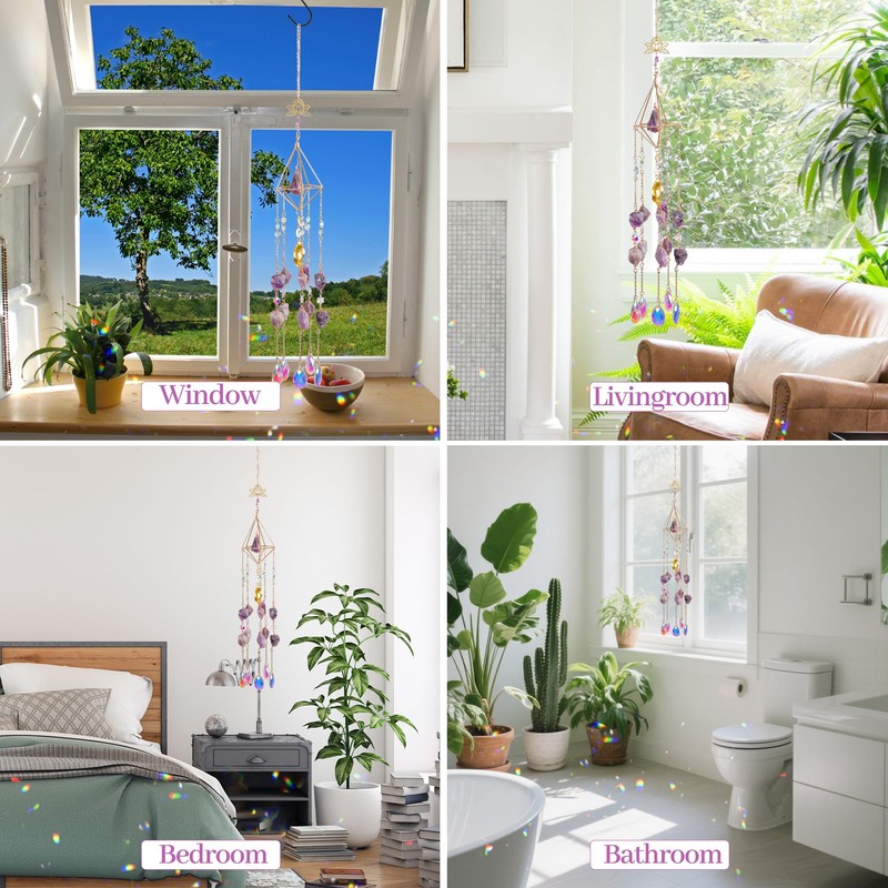 - Sun Catchers with Crystals: Window crystal sun pendant comes with crystal and Amethyst Crystal pendants, prisms will reflect and add lots of pretty colors into your room when the sunlight hits them just right,throwing lovely rainbow to your home decor,they are each unique and eye-catching,you can enjoy them when you pass by