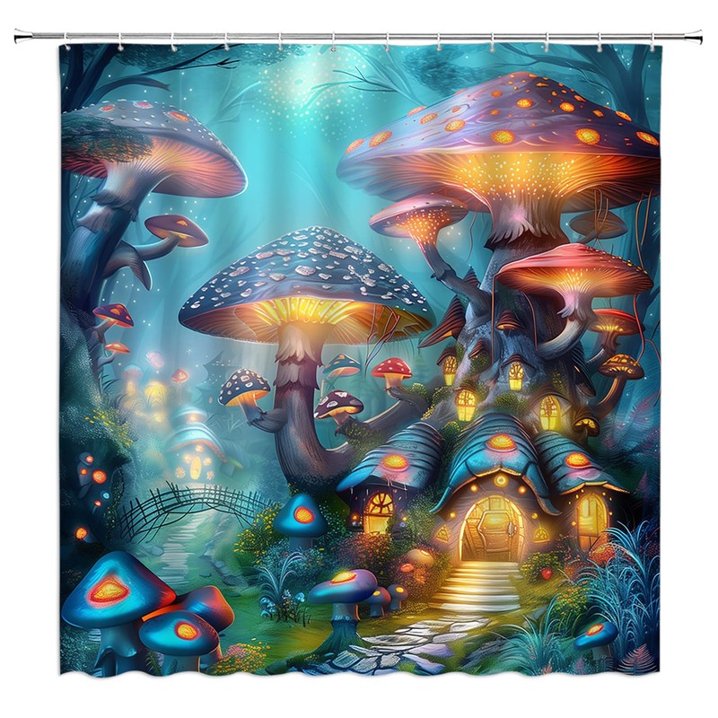 AMFD Fairy Tales Shower Curtain Magical Forest Mushroom Fairyland Enchanted Forest or Girls Kids Bathroom Curtains Decor Fabric Set Include Hooks,(70"" WX70 H), Blue Yellow