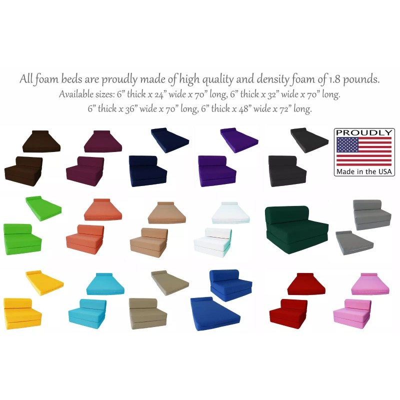 Proudly made in USA - High foam density of 1.8 pounds - CertiPUR-US.Filled with 1.8 pounds High density white foam.Color: Navy Blue. The cover is not recommended to remove for washing.Bed dimensions: 6 in Thick x 24 in Wide x 70 in Long.Dimensions of the folding chair:12 inch high at the sitting position.23 inch high on the backrest.24 inch wide30 inch deep.Fabric material: 100% Polyester.Caring instructions: Only spot cleaned with a damp cloth, then give an airing to the foam bed. We highly recommend not to remove the cover for washing. You may use any large mattress cover sheet to put all over the foam bed for keeping it from getting dirty.