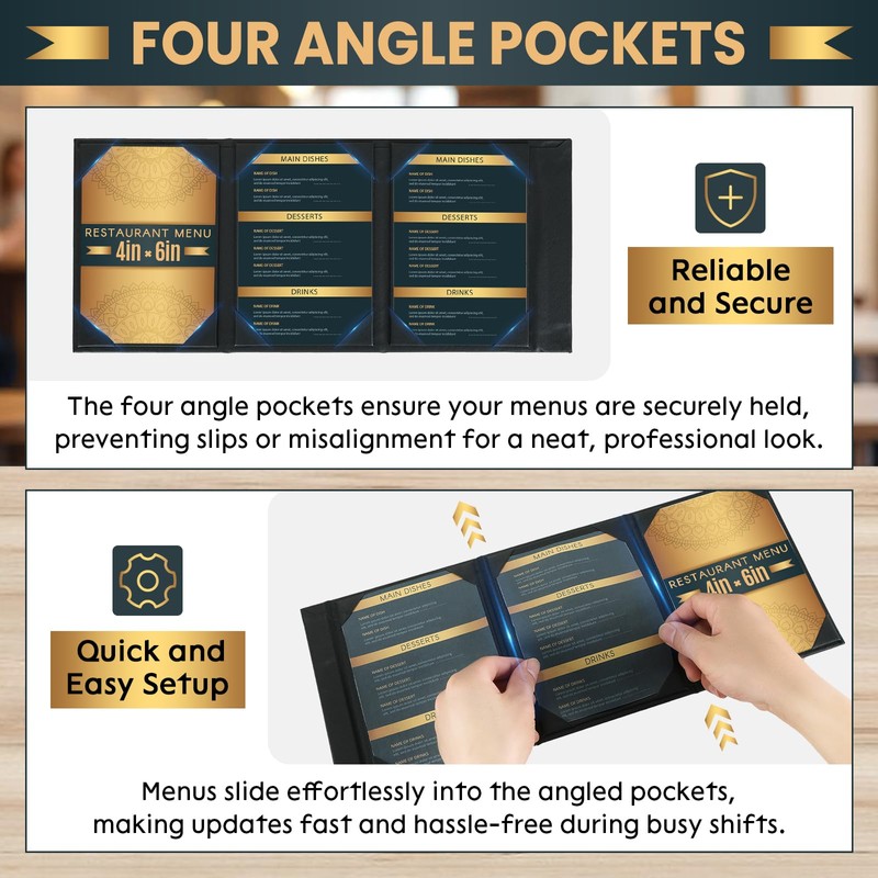 Stable and Secure Design:The sturdy 3-sided frame with 4 angled pockets holds your menus firmly in place.