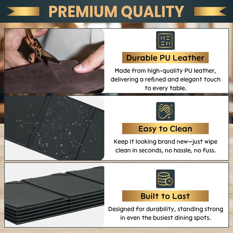 - Convenient and Easy to Clean: Foldable for easy storage, our leatherette table tents save space and are simple to clean with a wet towel or tissue, making them perfect for busy restaurant environments.