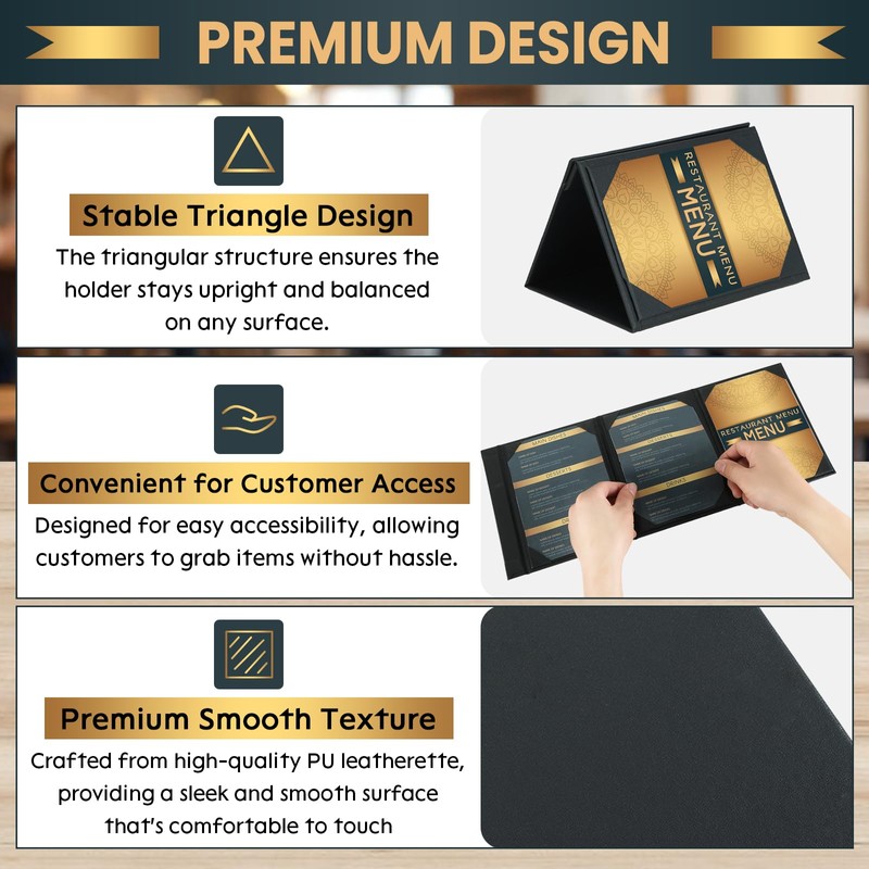 - Elegant and High-Quality Materials: Crafted from premium materials with a soft-touch finish, our table tents menu holders add sophistication to any setting, whether a café, restaurant, bar, or event venue.