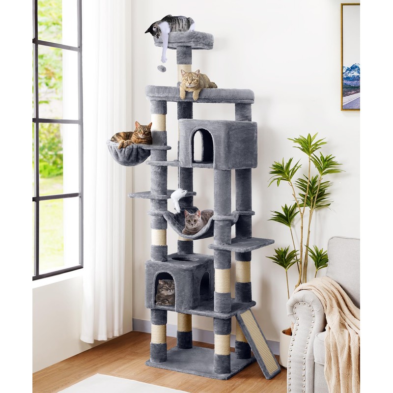 - Ultimate Playground Activity Center: Endless entertainment with 6-in-1 play stations! Features sisal-wrapped scratching posts and a scratching board to save furniture, a comfortable hammock, hanging ball, and multi-level platforms for jumping. The activity center satisfies natural instincts - from climbing to ambushing - keeping energetic cats engaged for hours