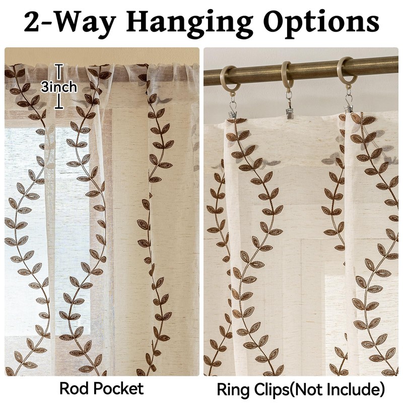 - Set of 2 panel linen embroidered Leaf String Floral sheer curtains