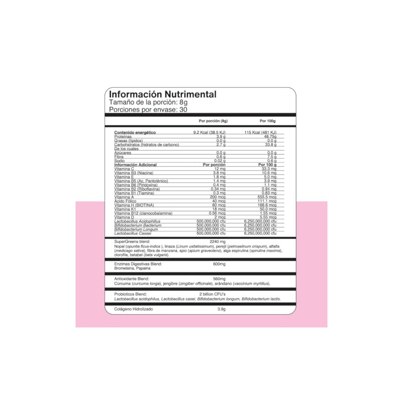 - CADA CUCHARADA contiene 3,9 gramos de colágeno hidrolizado, 2 mil millones de probióticos UFC, enzimas digestivas, vitaminas (C, B1, B2, B3, B5, B6, B12, A, K1, D), biotina y superalimentos como la espirulina y la clorofila.