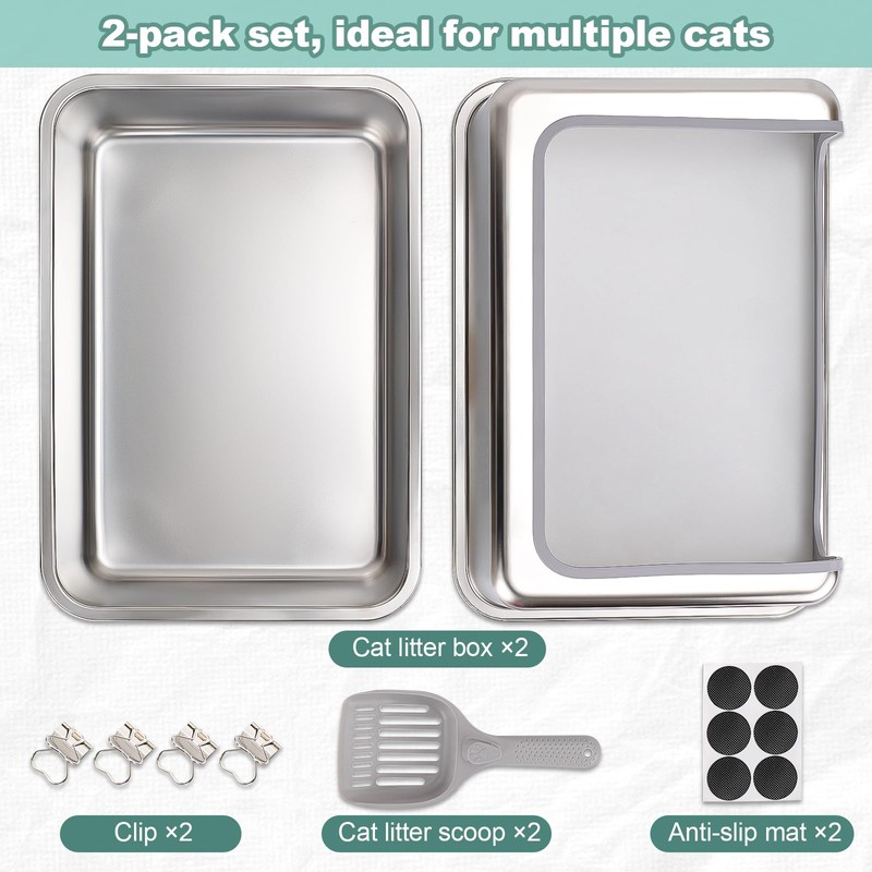 2-pack stainless steel litter boxes made entirely of metal, waterproof and easy to clean, designed to prevent cats from scratching and injuring their paws. The top opening allows for easy access for the cats, and the extra-large capacity is perfect for multi-cat households. This economical set is both stylish and sophisticated, providing your cats with a high-quality all-metal luxury living space