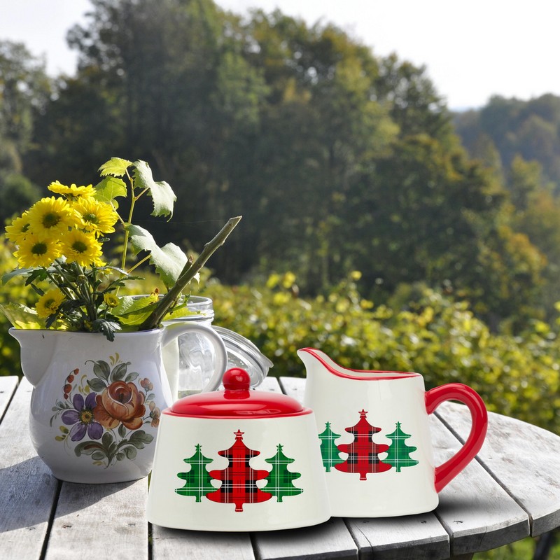 - Festive Coffee and Tea Service: Elevate your beverage rituals with the Amici Home Christmas Tree Sugar and Creamer Set. The 8oz creamer pitcher, adorned with a plaid Xmas tree motif, adds a touch of holiday charm to your table, while the sugar bowl with lid keeps essential ingredients within easy reach.