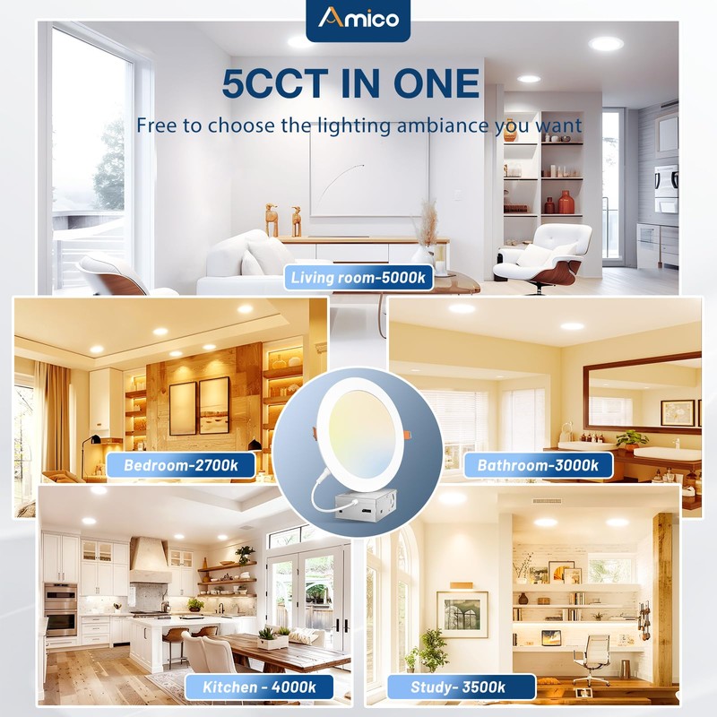 Amico 2700K-5000K Selectable, 7 Inch 1 Pack 5CCT Ultra-Thin LED Canless Reces...