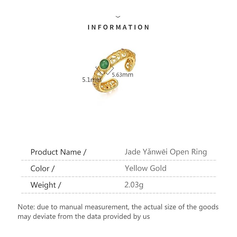 - π Stylish Design:** Elevate your style with our stunning 14K Gold and S925 Silver Hetian Jade YΗnwΔi Open Ring. Inspired by traditional Chinese aesthetics, this ring boasts an elegant design that seamlessly blends modern sophistication with ethnic charm. Make a fashion statement with this exquisite hand ornament.