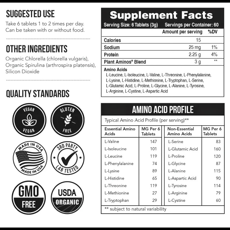 -Aminoácidos esenciales 100% orgánicos a base de plantas: estos aminoácidos se obtienen de alimentos enteros crudos, combinando las formas más densas de aminoácidos de espirulina orgánica y clorella orgánica. Se ha demostrado que tienen 4 veces más absorción que los aminoácidos a base de suero de leche o soja.