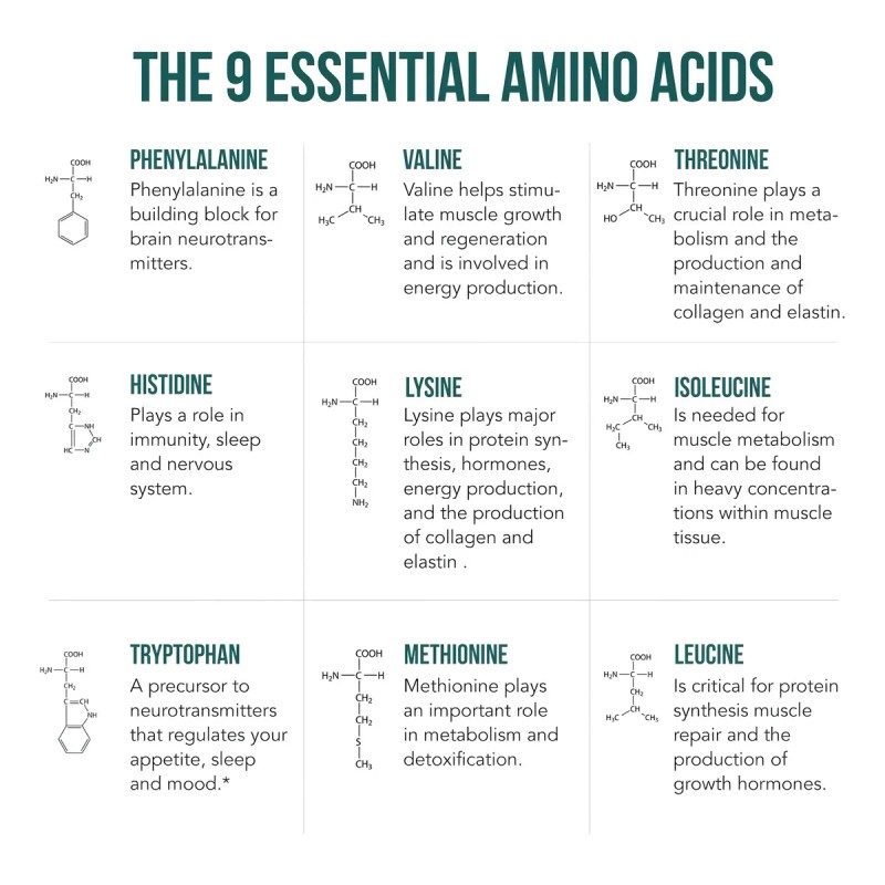 -Apoyan el rendimiento, la energía, la función mental y el estado de ánimo: los aminoácidos apoyan el rendimiento atlético general y ralentizan el inicio de la fatiga, permitiendo tener más energía y resistencia. Son esenciales para los neurotransmisores del cerebro, que influyen en todos los aspectos de la función cerebral y el estado de ánimo.