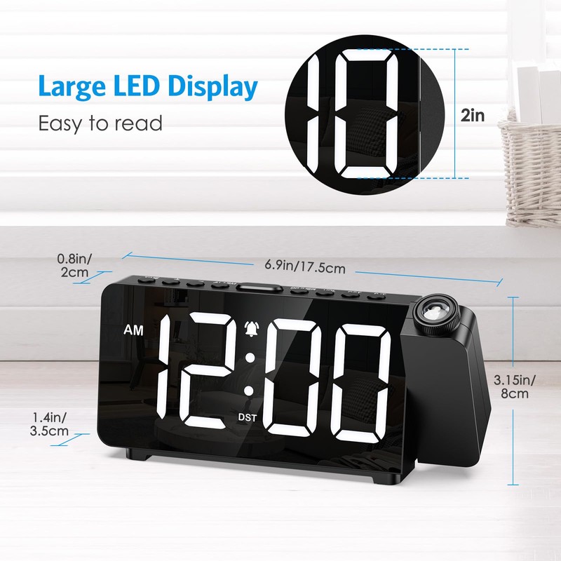 - Projection Feature with Customizable Settings: Project the time onto any surface with adjustable brightness in 3 levels, including an ultra-low third level. Rotate the projected numbers 180° for optimal viewing and adjust the focus for perfect clarity. This feature adds a unique touch to your bedroom decor