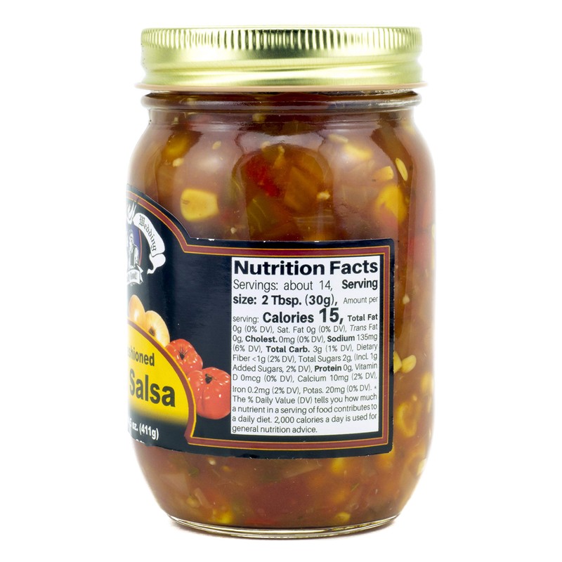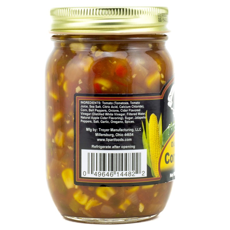 - USA made in Ohio's Amish Country Ingredients: Tomato (tomatoes, tomato juice, sea salt, citric acid, calcium chloride), corn, bell peppers, onions, cider flavored vinegar (distilled white vinegar, filtered water, natural apple cider flavoring), sugar, jalapeno peppers, salt, garlic, oregano, spices.
