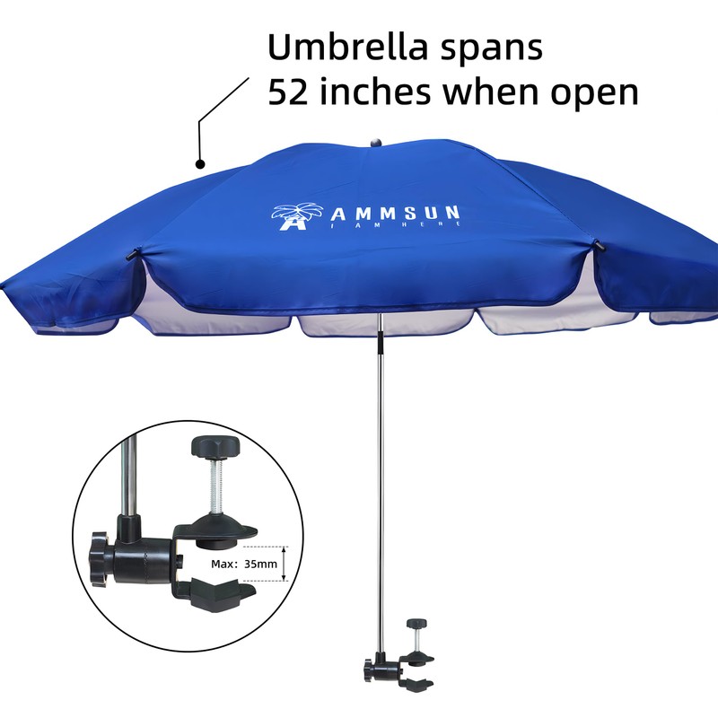 AMMSUN XL Chair Umbrella with Universal Clamp 52 inches and 360-degree Swivel UPF 50+, Portable Clamp on Camping or Beach Chair, Stroller, Wheelchair, Golf cart, Blue, Large-sized