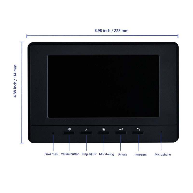 • 7 MAIN FEATURES --- 7 Inch LCD screen;16 different kinds of door bells chimes; Volume, brightness and contrast are adjustable; IR camera with night vision;Electric lock-control function;Handfree intercom;Auto turn off.