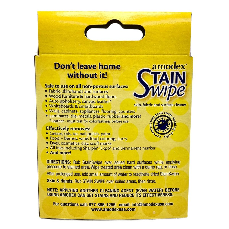 - Amodex Stain Swipe Surface Cleaner. New! Removes whiteboard ghosting! Removes Sharpie. Ink/dye. Crayon. Scuffs. Wine. And much more! 10 handy wipes for on-the-go stain treatment. Home. Car. Office. Travel. School.