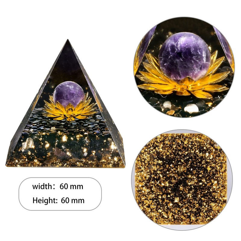 - Amethyst Crystal Pyramid: The size of the amethyst orgone pyramid is about 2.36 x 2.36 x 2.36 inches (60 x 60 x 60 mm), weight 105 - 115 grams. It is made of copper lotus, amethyst stone sphere, black obsidian stone chips, and clear resin. Each pyramid is handmade by craftsmen, full of lots of love and wishes. It will come with a gift box, ready to be a wonderful surprise.