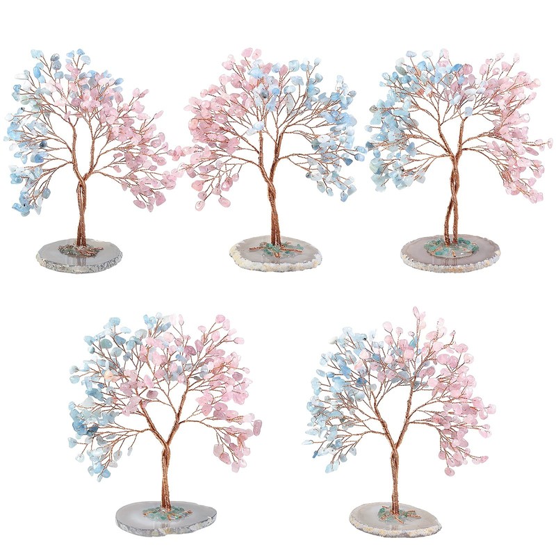 - Handmade Healing Stone Tree: The crystal tree bonsai is made of aquamarine, rose quartz, green aventurine stone, agate, and copper wires. It is total height 5.9-7.1 inches (14.99-18.03 cm), width 3.9-6 inches (9.9-15.24 cm). The copper wire tree trunk is thickness 0.12-0.2 inches (3-5 mm); Agate slice base is diam 2.36-3.94 inches (60-100 mm), thickness 0.12-0.2 inches (3-5mm); Crystal chips are size 0.2-0.59 inches (5-15 mm).