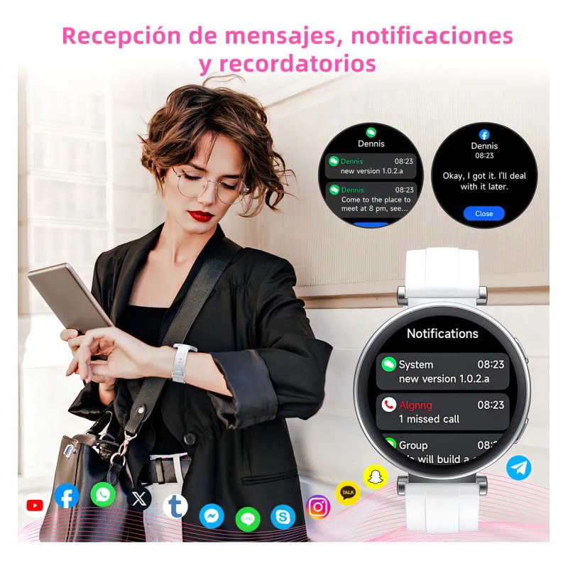 AMOLED SmartWatch Mujer AITAFY Reloj inteligente Llamadas Bluetooth Asistente voz IA Notificaciones mensajes 3ATM Resistente al Agua Monitoreo salud24h Salud femeninaal Monitoreo del sueño Diamante