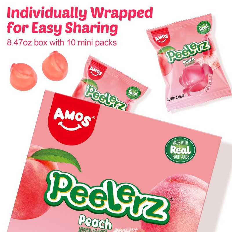 AMOS Peelerz Peach Gummy Candy, Peelable Fruit-Shaped Candy, 10 Snack Packs in Box, Chewy Peach Flavor Treat for Kids and Adults, 240g Box (8.47oz)