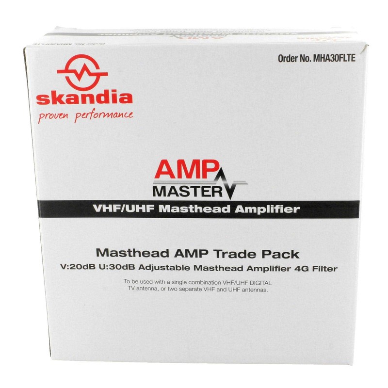 Improve your TV and radio signals with this antenna amplifier from AmpMaster. As the name suggests, a masthead amplifier is designed to be installed on the antenna mast. Mounting it close to the antenna reduces signal noise. The power adapter simply plugs into a standard mains AC 240V wall outlet and transmits power along the antenna cable up to the amplifier, which gives a boost to the antenna signal of up to 30dB for UHF and 20dB for VHF. The amount of gain can be adjusted using the small control knob on the device.
