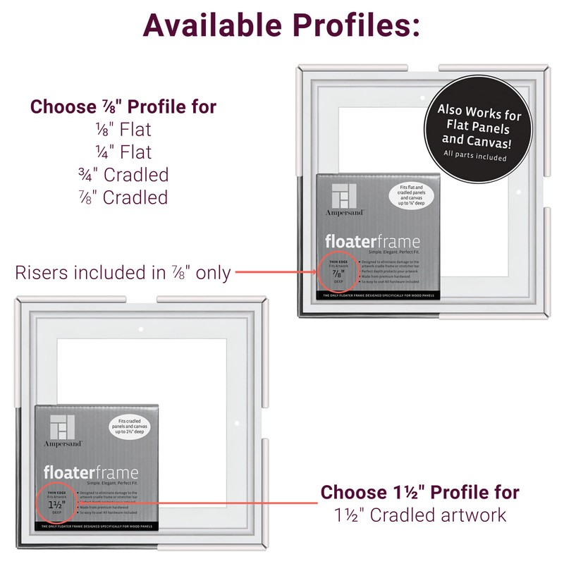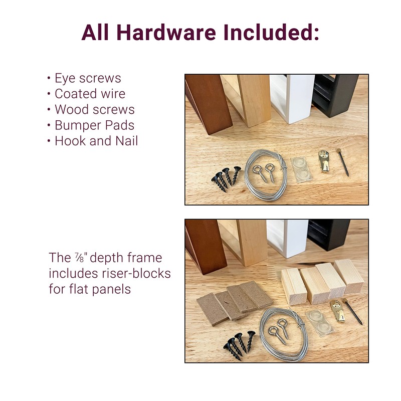 - EASY TO USE: All hardware is included! Each wood Floaterframe includes a hardware set complete with screws, hanging wire, bumper pads, hanging hook, and nail. Riser blocks are included with the 7/8" frame. An easy-to-use, DIY wood floating frame for canvas and panel paintings.