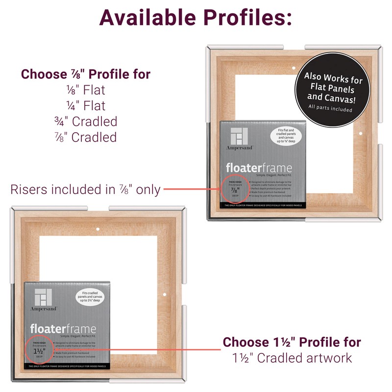 • EASY TO USE: All hardware is included! Each wood Floaterframe includes a hardware set complete with screws, hanging wire, bumper pads, hanging hook, and nail. Riser blocks are included with the 1 1/2" frame. An easy-to-use, DIY wood floating frame for canvas and panel paintings.
