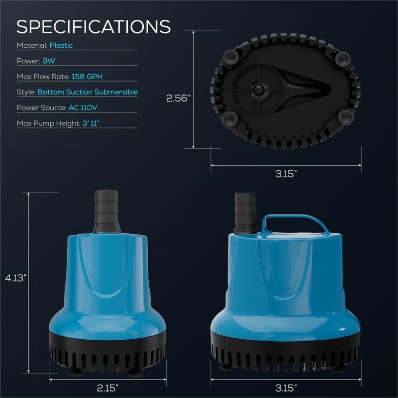 • High‑Output 158 GPH (600 L/H) Flow & 1.2 m Lift Compact 9 W motor delivers robust, steady water circulation for aquariums, fountains, hydroponic setups, and more.