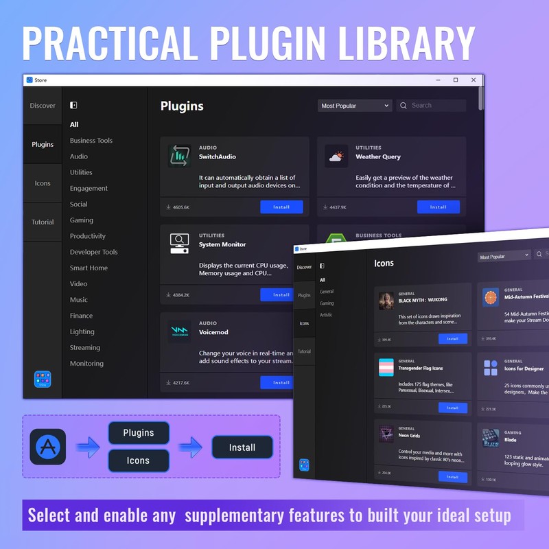 - [Wide Application Compatibility] This OBS stream controller has a wide range of software, applications and plugins options whether in the store or download from the computer. They work with OBS Studio, Streamlabs, Twitch, YouTube and more in the stream controller PC. You can also drag-and-drop, set up and download from the console's store, with a very large number of plugins and icons to fill your streaming.