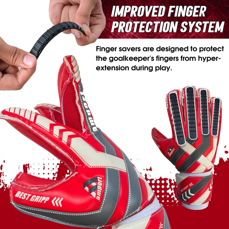 - [ Improved Finger Protection System ] Our Professional Goalkeeper Gloves contain Spines on the inside of the Fingers, to aid in Finger Support. These Finger Savers protect the Goalkeeper Fingers from hyper-extension and breaking of digits when catching the hard-kicked Football. The 8MM Soft Foam Padding between Backhand and Finger Spines ensures impact protection and ball Control.