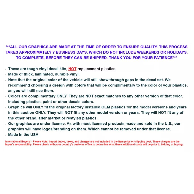 - Graphics will ONLY fit the original factory installed OEM plastics for the model versions and years in this auction ONLY. They will NOT fit any other model version or years. They will NOT fit any of the other brand, after market or restyled plastics.