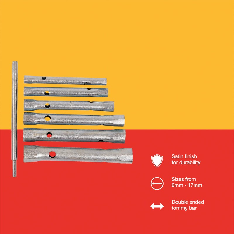- INCLUDES: Box spanner sizes: 6-7mm, 8-9m, 10-11mm, 12-13mm, 14-15mm and 16-17mm, plus a 150mm double-ended Tommy bar