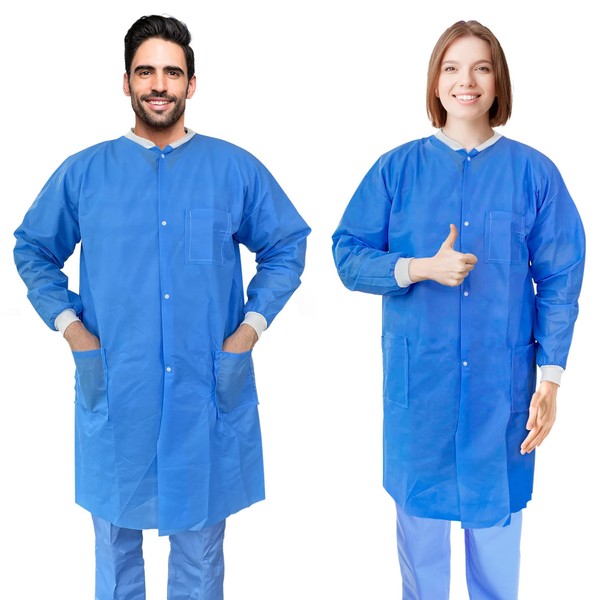 - Pack of 30 Blue Disposable Lab Coats large. The adult lab coat is engineered for comfort and durability. The protective adult lab coat comes with a knit collar, cuffs, plastic snaps, and 3 pockets for added convenience and functionality.