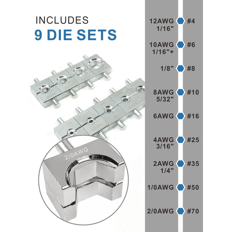 - Compatibility : Crimps 12 AWG to 2/0 AWG size copper and aluminum wires. Maximum crimping power:10 tons. Stroke : 12mm. The hydraulic crimper is suitable for power wires, electrical cables, battery cables and welding cables. Cable Cutter Cuts up to 5/32" stainless steel cable.