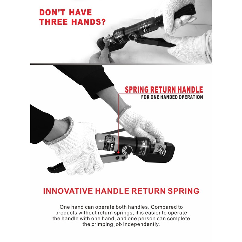 - Easy to use: On/Off control for fast operation, easy crimping and arm retraction when crimping aluminum or copper wire. A return spring is installed on the handle for easy one-handed operation of the tool.The C-style head makes side entry easier to change the dies.