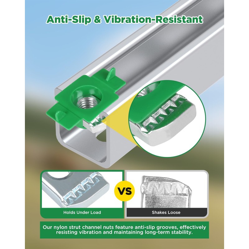 - Effortless Installation: Unlike problematic spring nuts that fall out or jam, our channel squeeze nut enables simple one-handed operation. Installation requires no tools: just compress, insert into the strut channel, and twist to lock. Exceptionally convenient for quick installations in tight, hard-to-reach spaces