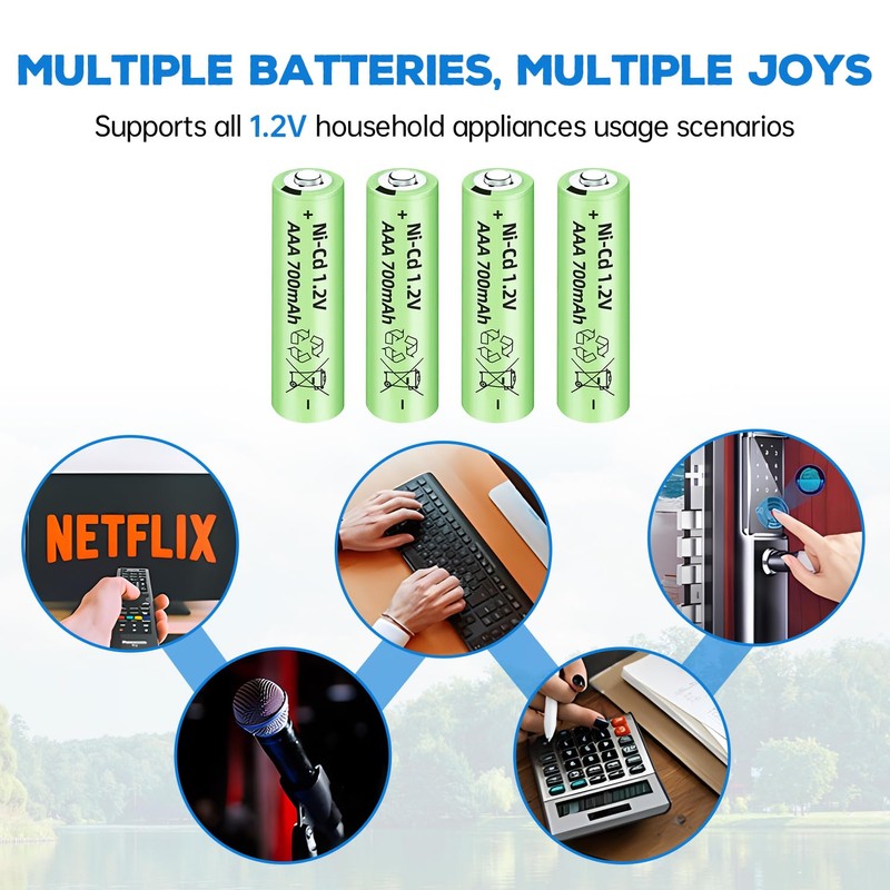 - ※ Size: 44mm high (1.73inch), 9mm diameter (0.35inch), 1.2V 700mAh AAA Ni-Cd rechargeable battery, including 12X1.2V Ni-Cd AAA 700mAh battery.