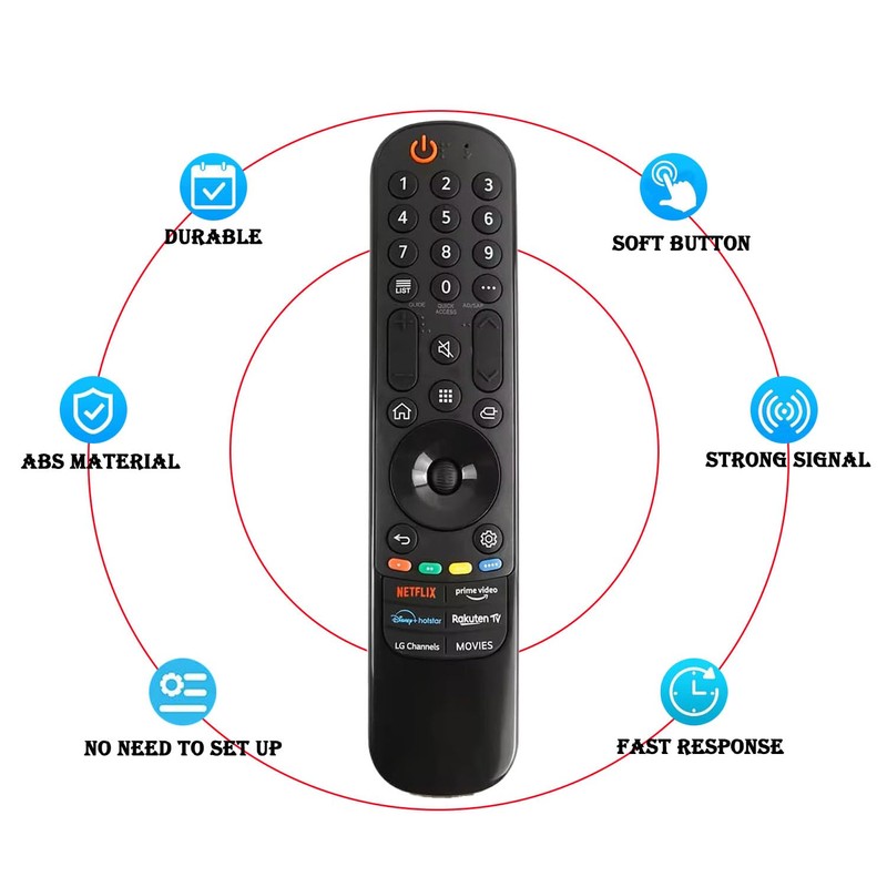 - [Features] This remote control has 6 shortcut keys: Nflix, Prim Video, Disnep+hotstar, Rakuten TV, LG Channels, MOVIES buttons. Easily access to your favorite apps.