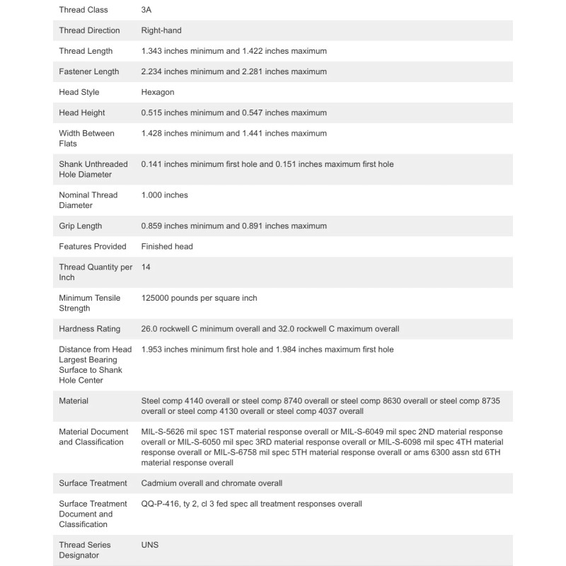 23G112 up for sale is a steel military aircraft shear bolt , this bolt has a 1 inch x 14 TPI thread and is covered under military NSN 5306-00-145-7062 and also aeronautical specification AN16-20 , this bolt has a smooth area under the head that is about 7/8 long the threaded are is about 1 3/8 long and has a cotter pin hole to lock the nut on. The threaded are under the cotter pin is about 1 7/8 long from the back of the pin to the head shoulder , the total length of this fastener is 2 3/4 long , nice fastener for many uses and also on the CH-53 D/E and might be used on many other projects where you need a big bolt , see photos for the public owned specifications related to this part , also see our store for more items like this we add new items weekly , thank you rwk