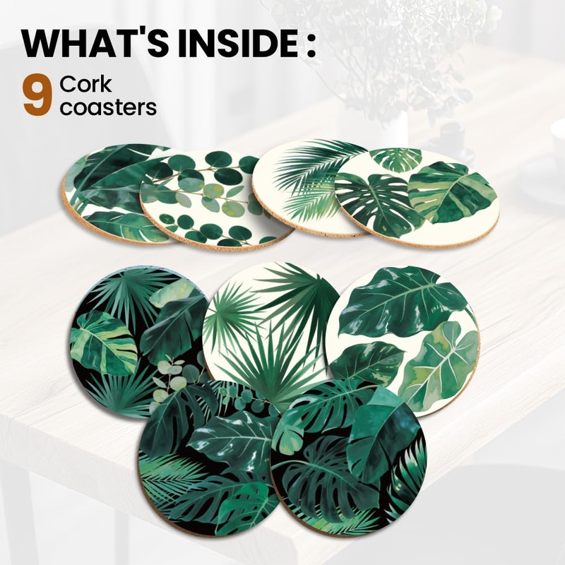 ANATTASOUL Cork Coasters, Pack of 9 Tropical Leaves Cork Coasters, Wood, Reusable Round Coasters, Reusable Absorbent Cup Coaster Mat for Home, Office and Bar