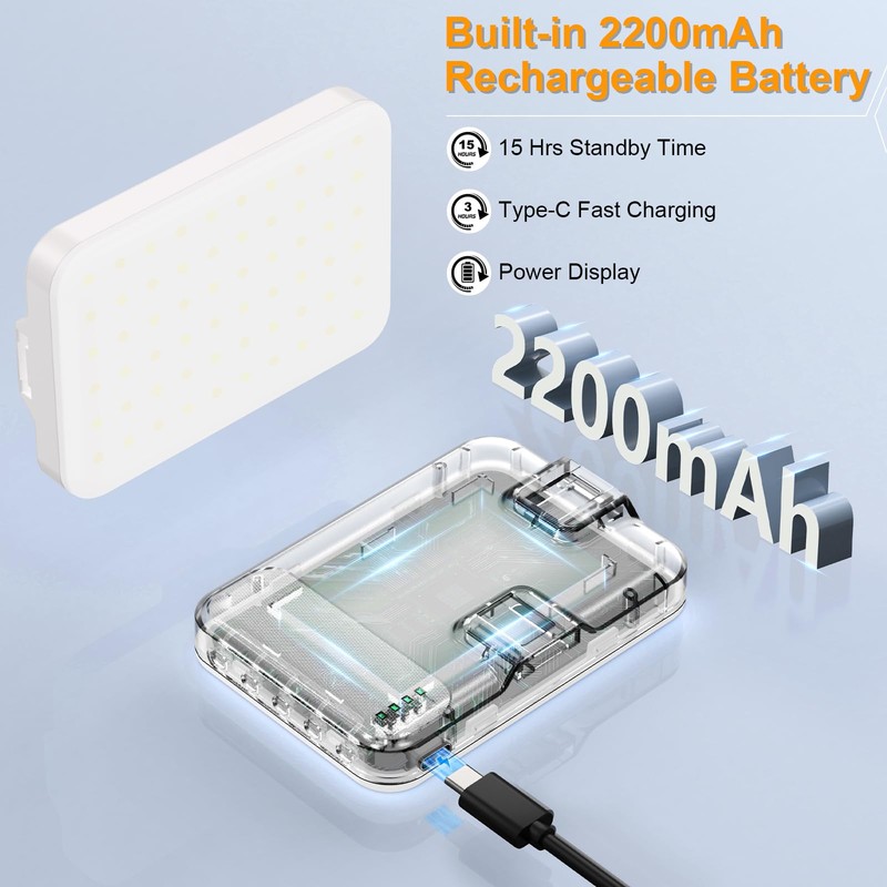 • 【2200mAh Rechargeable Battery】 The led selfie light built-in 2200mAh rechargeable battery and USB Type-C charging port. This cell phone fill light is easily charged by laptops, PCs, power banks, USB chargers, car chargers, etc. Allows you to use it everywhere. The camera light can be full-charged in about 2h, and offer a 130-minute operation at 100% brightness, over 15 hours for 10% brightness.