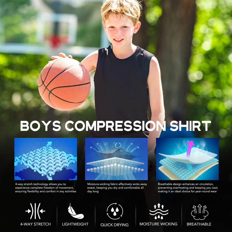 - Four-Way Stretch: This boys compression sleeveless shirt features four-way stretch fabric, providing unrestricted movement for boys in every direction.So your child can play comfortably and confidently