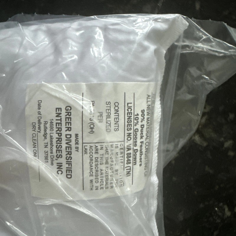 New and sealed. Made by Greer Diversified 90% duck feathers 10% goose down