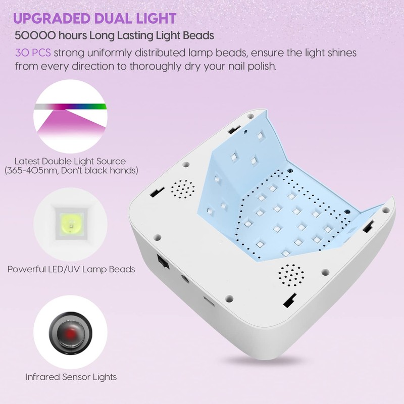- ❤【Upgrade Light Source】: ANBEISTEE lámpara de uñas viene con 30pcs fuente de luz dual cuentas de la lámpara, la luz brilla desde todas las direcciones y se seca el esmalte de uñas rápidamente. Y la luz es suave (395-405nm)y no deslumbrante que no lastimará sus ojos y sin manos negras. Esta lámpara de curado flash puede secar rápidamente todo tipo de manicura y arte de uñas.